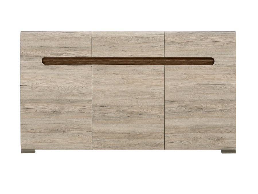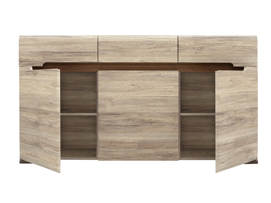 - Для открывания дверей и ящиков используется фрезеровка на нижней панели ящиков и верхней панели дверей, которая декорирована с внутренней стороны рифленой планкой из плиты МДФ цвет Дуб венге Магия;