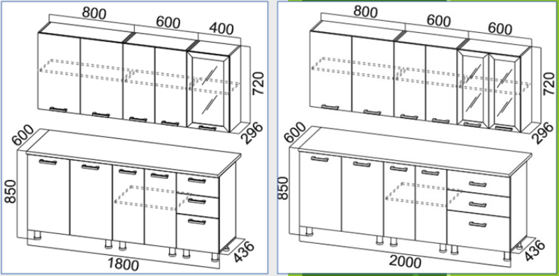 - Нижние модули: глубина шкафов с учетом фасадов — 436 мм, высота шкафов с учетом ножек и столешницы — 850 мм,