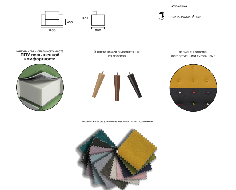 Длина 1480, высота 870, глубина 860 мм