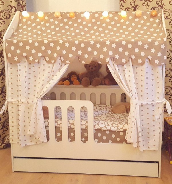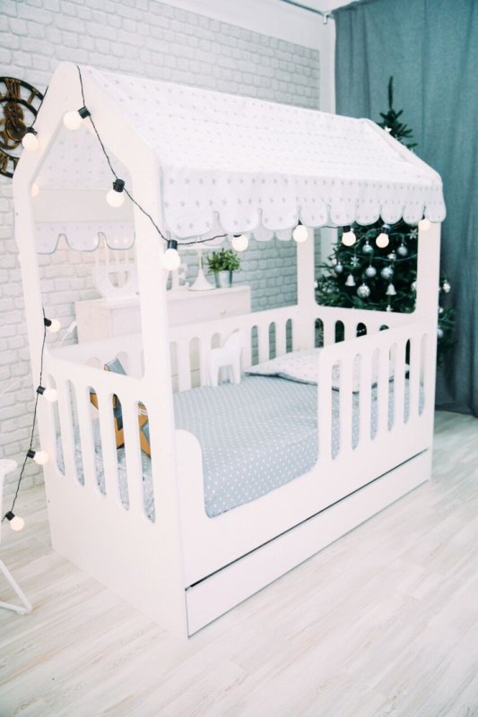 Под заказ можно дополнить домик кроватку аксессуарами: балдахин на крышу, комплект постельного белья, комплект шторы (2 шторы + 2 завязки)