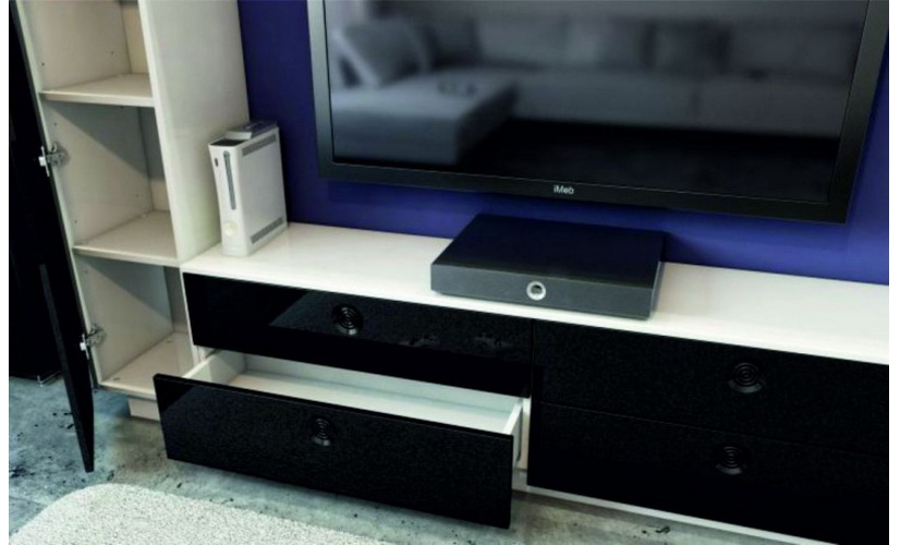 Благодаря своему уникальному виду и привлекательной цене, стенка iMeb сразу завоевала любовь покупателей. Черные глянцевые фасады и белый корпус этой современной гостиной, напоминают дизайн телефона iPhone. Все дверцы оснащены механизмом «Push to Open», а значит, не имеют ручек и открываются простым нажатием на выемки в фасаде, которые тоже стилизованны под центральную клавишу телефона iPhone. Черно-белая гостиная iMeb имеет дорогую фурнитуру, которая обеспечит вам комфортную эксплуатацию и продлит срок службы изделия.