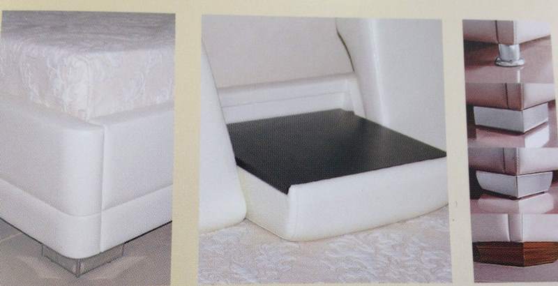 Кровать изготавливается как в эластичной экокожи на тканевой основе, так и существует возможность изготовления из однотонных тканей флоковой, велюровой и бархатной основах. Кровать выполняется в 3-х размерах, соответствующих размерам спального места 1600*2000 мм, 1800*2000 мм и 2000*2000 мм. По вашему желанию кровать можно оснастить двумя газовыми амортизаторами для подъема ортопедического основания.