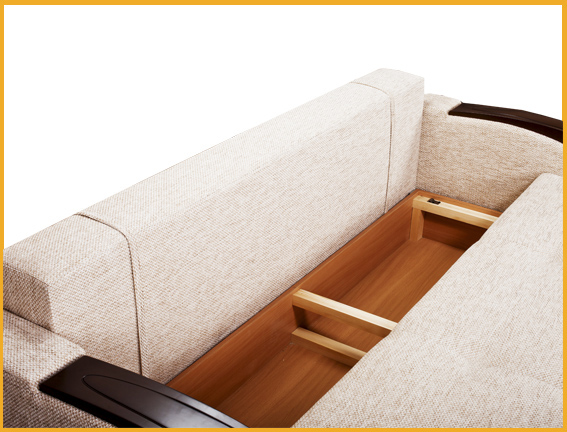 Современный стильный дизайн. Пластиковые дугообразные накладки на подлокотниках. Возможность использования как центральный обьект интерьера. При трансформации требуется расстояние между стеной и диваном. Ровное спальное место. Для удобства присутствует задняя стенка в режиме спального места. Наличие ящика для хранения спальных принадлежностей. В основании спинки и сиденья деревянная рамка, на которую кладется блок независимых пружин с настилом из эластичного пенополиуретана. Диван комплектуется съемными приспинными подушками, наполненными синтепухом. Механизм раскладки-еврокнижка.