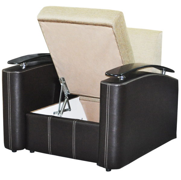 Удобное кресло в современном стиле. В основании сиденья латы и эластичный пенополиуретан. Декоративные накладки на подлокотниках. В основании кресла присутствует емкость для хранения постельных принадлежностей. Подлокотники съемные.