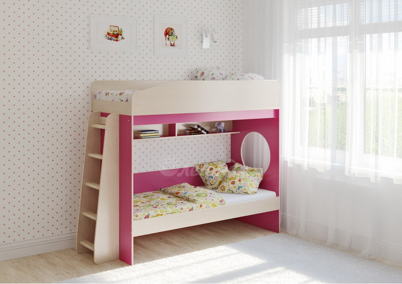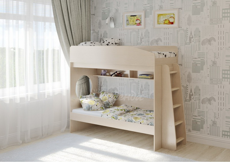 Над нижним спальным местом располагается встроенная двухсекционная полка, в которой удобно хранить книги, учебники, тетради, канцелярию и другие нужные вещи.