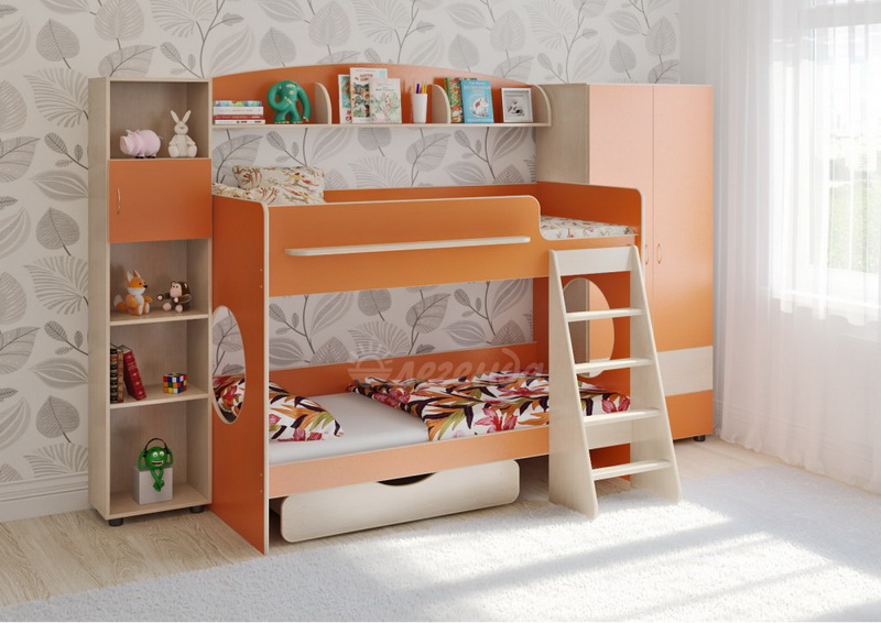 Классическая детская невысокая двухъярусная кровать с двумя параллельными спальными местами размером 1800х800.