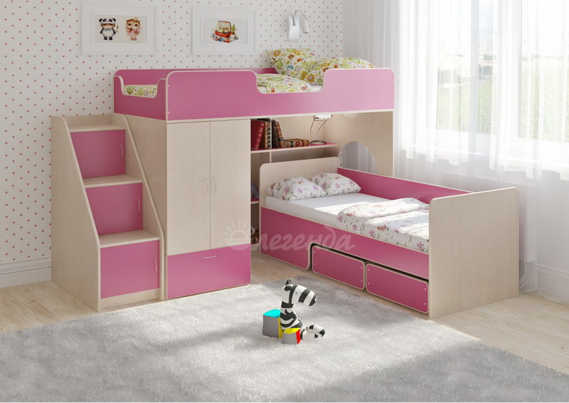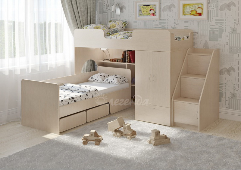 Под верхним спальным местом располагается стеллаж,отлично подходящий для хранения игрушек.Стеллаж состоит из трех полок, разделенных на две секции – удобно для поддержания порядка и сортировки предметов.