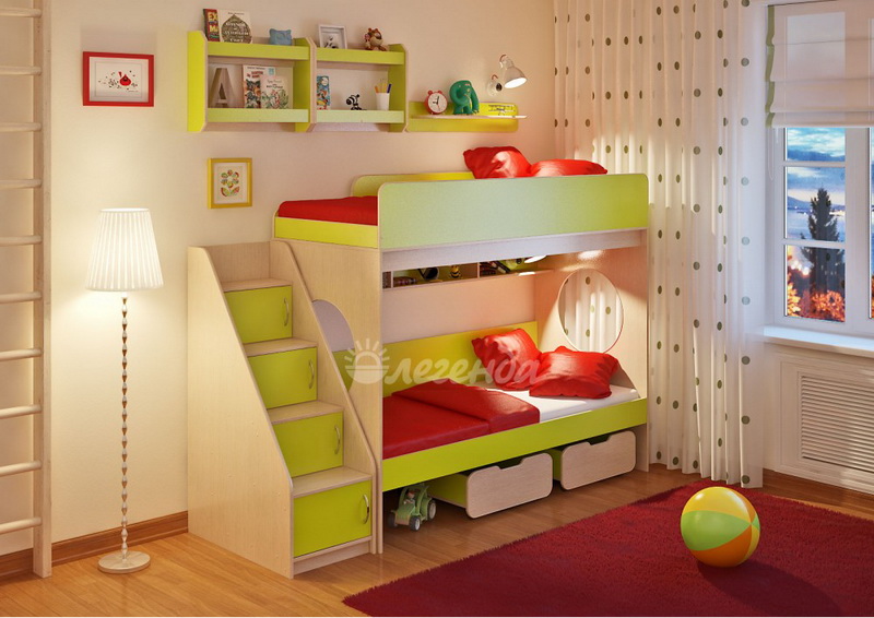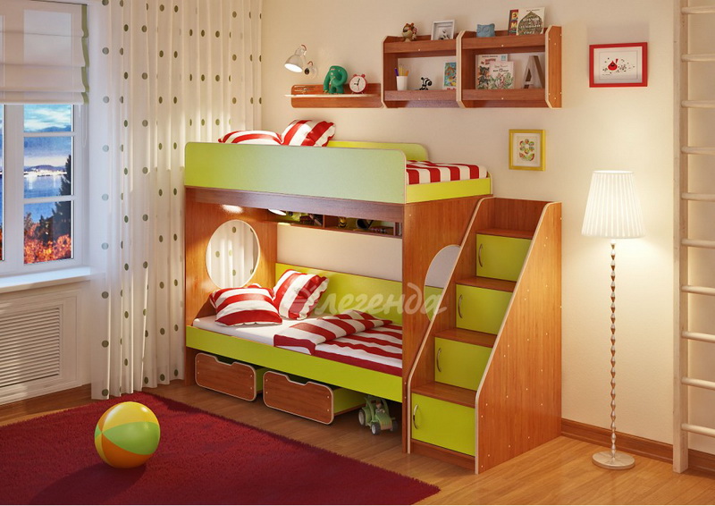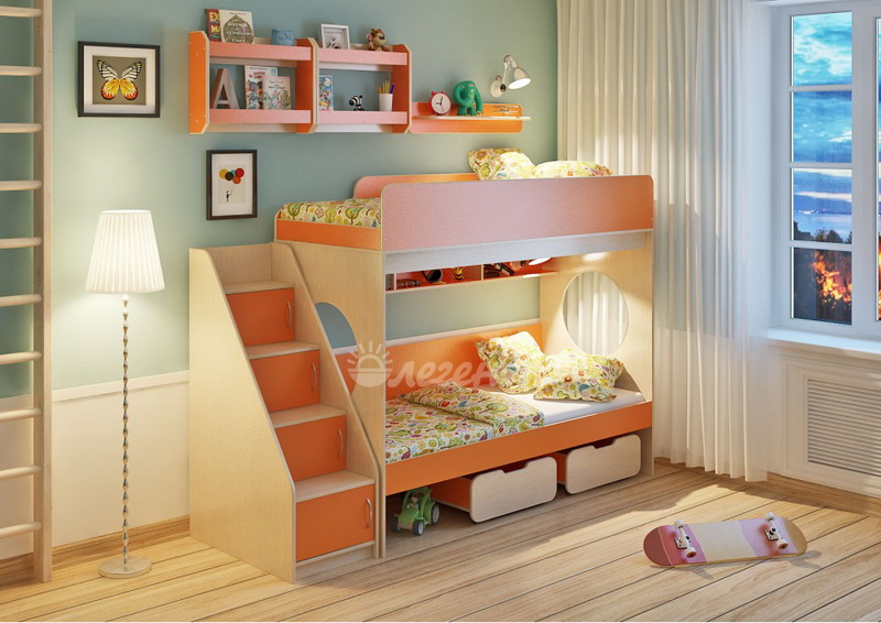 Над нижним спальным местом располагается встроенная трёхсекционная полка,в которой удобно хранить книги,учебники,тетради,канцелярию и другие нужные вещи.