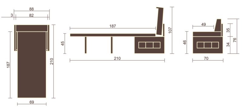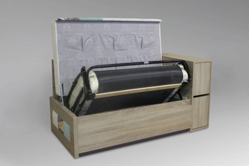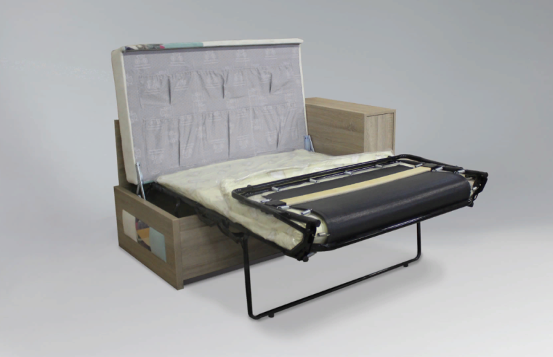 - Модель со спальным местом. Диван имеет механизм трансформации «французская раскладушка». Механизм трансформации весьма прост и требует минимальных усилий: достаточно снять подушку и поднять конструкцию сиденья, после чего установленный горизонтально механизм раскладушки, разворачивается и устанавливается на опорные ножки. При раскрытии спального места ножки автоматически раскладываются и жестко удерживаются в перпендикулярной полу позиции с небольшим наклоном вперед. Этот механизм трансформации напоминает разворачивание свитка и обеспечивает дивану компактность в сложенном виде и достаточно просторное спальное место в разложенном.
