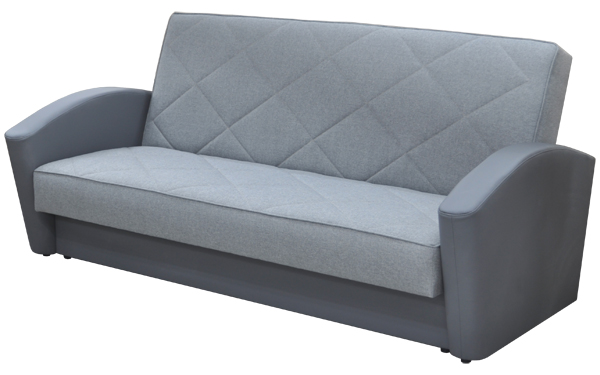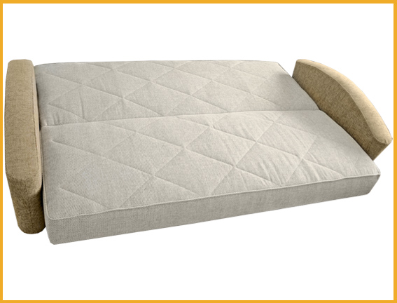 Ровное спальное место. Боковины дугообразной формы. Для трансформации дивана требуется расстояние между стеной и диваном. В основании короба имеется емкость для хранения постельных принадлежностей. Сиденье и спинка сформированы на основе деревянных рамок, на которые кладется матрас, состоящий из пружинного блока с настилом из термовойлока и эластичного листового пенополиуретана, соединенных между собой механизмом трансформации «книжка».