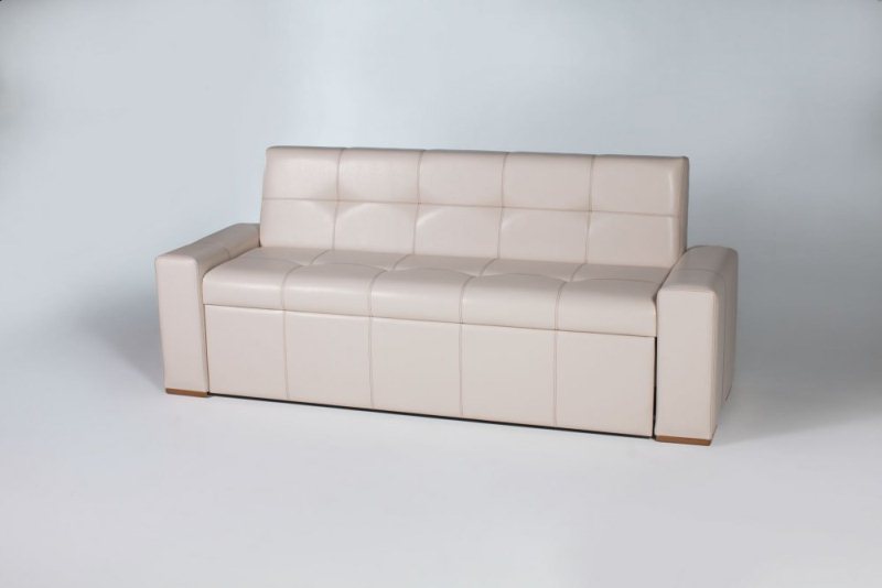 - Модель со спальным местом. Диван имеет механизм трансформации «дельфин», позволяющий получить ровную и оптимальную по площади спальную поверхность. Механизм трансформации весьма прост и требует минимальных усилий: достаточно выкатить из-под сиденья дополнительную платформу (выкатывается по направляющим) и, взявшись за специальные петли, поднять спальное место до уровня сиденья дивана. Тем самым удается получить сплошную и ровную спальную поверхность.