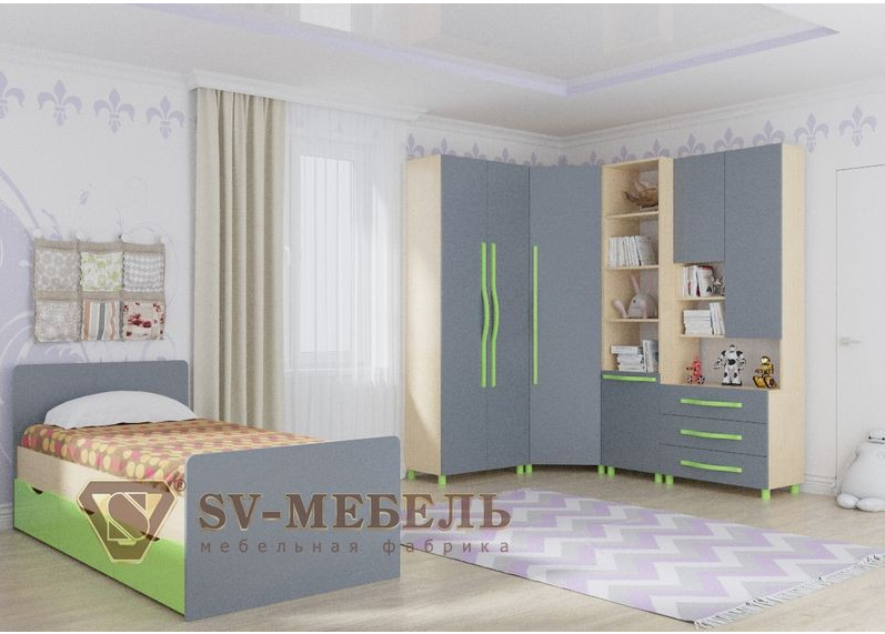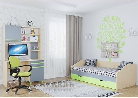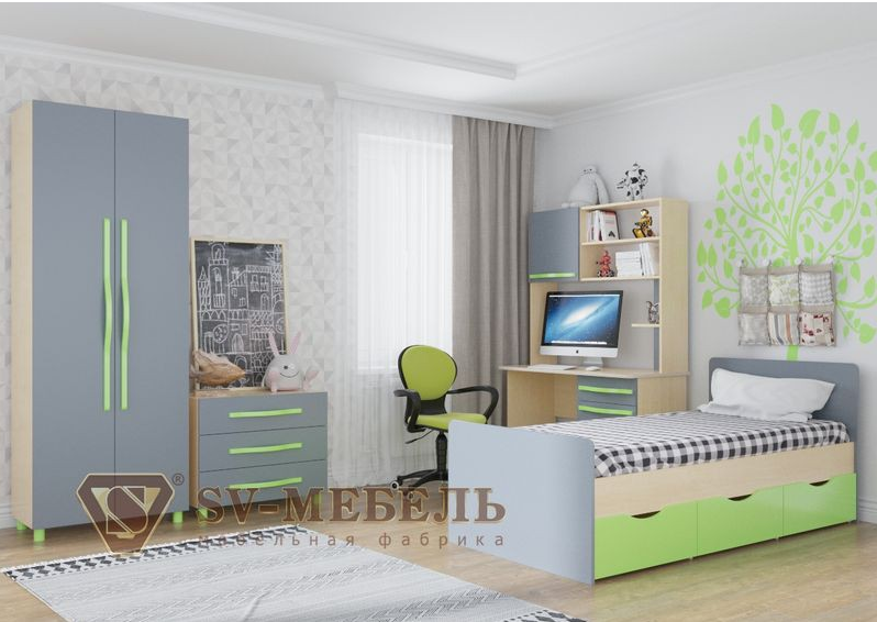 Детская серия "Алекс 1" - идеальное решение для детской комнаты, созданная больше для подростков. Выполнена в необычных тонах. Это очень стильная и современная модель. Ручки выполнены в цвете Лайм, что прекрасно сочетается с цветом фасадов: Титан.
