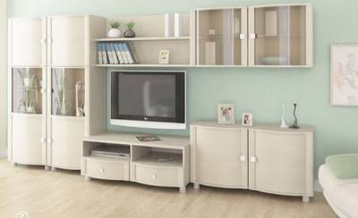 Гостиная ОЛИВИЯ №14 Гостиная Оливия №14 одна из самых красивых и оригинальных готовых композиций фабрики Лером. Особенно в цвете дуб беленый. Изысканное расположение стеклянных вставок создает эффект шахмат. Два невысоких шкафа ШК-316 кажутся одним цельным элементом, но очень изящным. Как его продолжение, следуют открытые полки ПЛ-302, а затем антресоль АН-303. Под ними, симметрично, расположились вместительная тумба ТБ-304 и ТБ-307 под телевизор с нишами для другой видео аппаратуры.