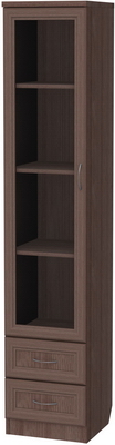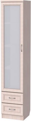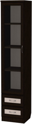 Эта модель шкафа подойдет для сочетания с другой мебелью из того же набора. Его высота и то, что в нем присутствуют ящики, визуально разбавляет сплошные витрины на остальных элементах и по-своему делает комплект разнообразным.