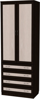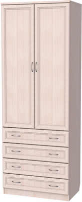 Очень практичная модель шкафа, которая представляет собой комбинацию платяного шкафа и комода с четырьмя вместительными ящиками. Верхняя часть оборудована штангой, на которую можно вешать костюмы, платья, в общем, все то, что носится сейчас. В ящики комода можно положить аксессуары, белье, любые мелочи.