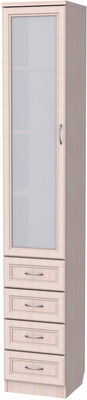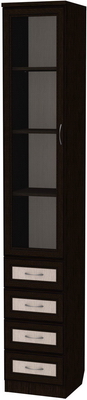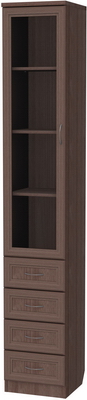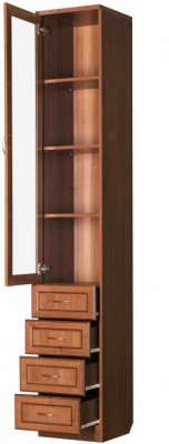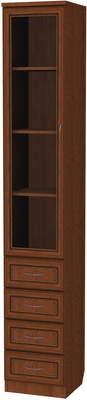 Шкаф разделен на два отделения. Верхнее отделение предназначено для хранения книг. В нем, за стеклянной дверью расположены четыре полочки. Полки обладают одинаковым размером и крепятся они на равном расстоянии одна от одной. Большим преимуществом является то, что смоделированы полочки таким образом, чтобы на них можно было выставлять книги любых форматов, даже самые большие, наподобие энциклопедий, справочников, словарей, атласов.