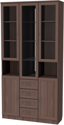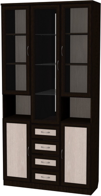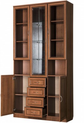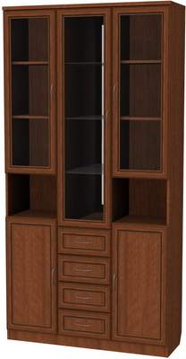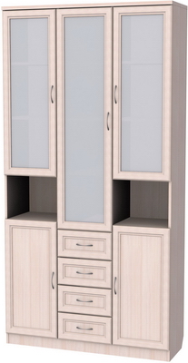 Визуально шкаф разделен на две части: верхнюю и нижнюю. Верхняя часть, в свою очередь, тоже разделена на три части. По центру находится большое отделение с четырьмя полочками, особенность полочек заключается в том, что выполнены они из стекла и дополнены зеркальной задней стенкой. Очень красиво будут смотреться расположенные тут, к примеру, хрустальные сервизы. По бокам, от центрального отделения, расположены еще два дополнительные. Они укомплектованы тремя деревянными полочками, одинакового размера и равноудаленными одна от другой. Там более удобно будет хранить посуду для повседневных нужд. Под ними расположены дополнительные, полностью открытые полочки, предназначенные для хранения разнообразных сувенирчиков, статуэток, фотографий и прочих, «радующих глаз», вещиц. Все двери выполнены из древесины и стекла.