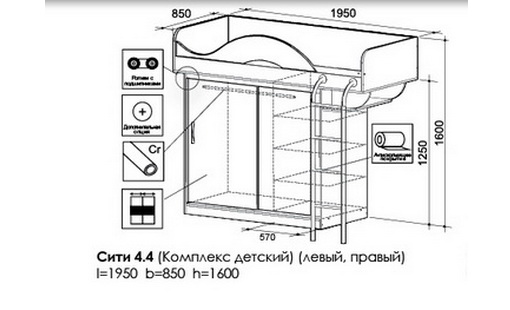 Мебель упакована в гофрокартон, комплектуется фурнитурой ведущих зарубежных и российских производителей.Размеры (ШхГхВ): 1950х850х1600 мм, спальное место 800х1900 см. Под спальным местом расположен шкаф-купе. Внутреннее пространство шкафа разделено на два отделения со штангой и полками. Лестница в комплекте.