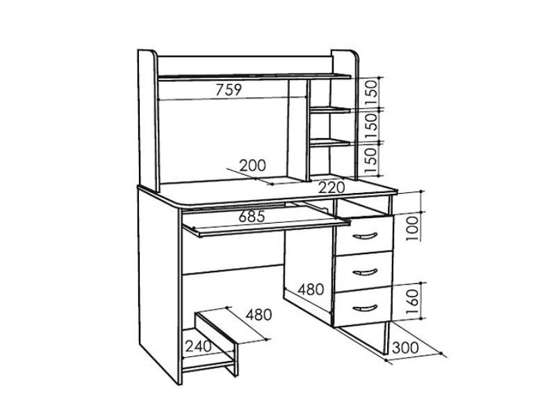 Каркас - ЛДСП 16 мм.Фасады ящиков: ЛДСП 16 мм.Ручки (3 шт.) - металлические.Кромка наружных элементов (столешница) - кант Т-образный, декорированный, АБС