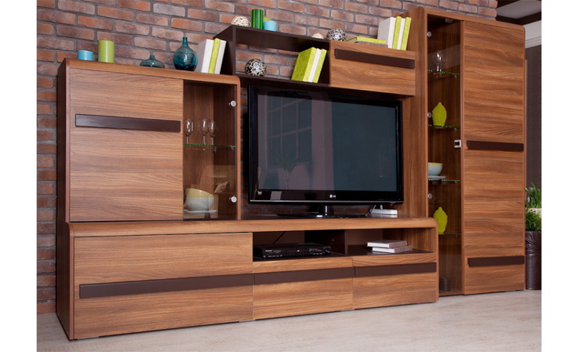 Модульная гостиная «София» - выполнена в минималистском дизайне с использованием выразительной древесной текстуры декора, чем и привлекает к себе внимание. Стеклянные полки подсвечиваются. Другой особенностью серии «София» являются ручки, изготовленные из МДФ и спроектированные на всю ширину фасадов.