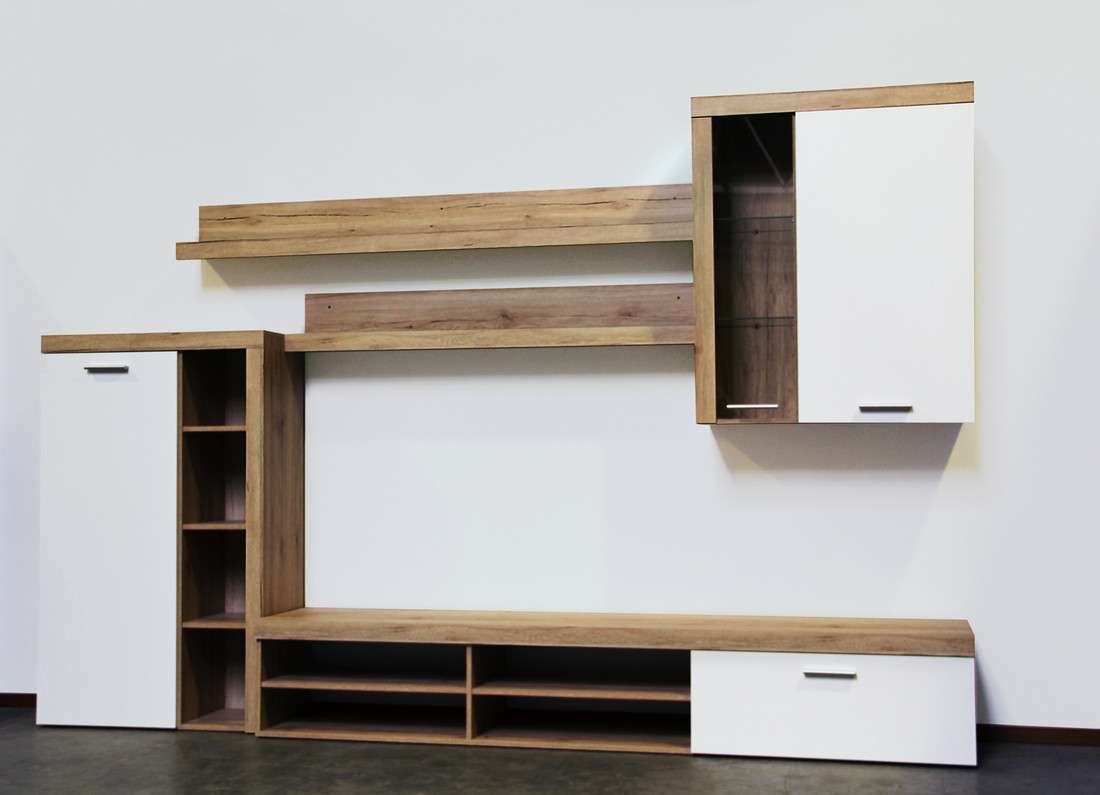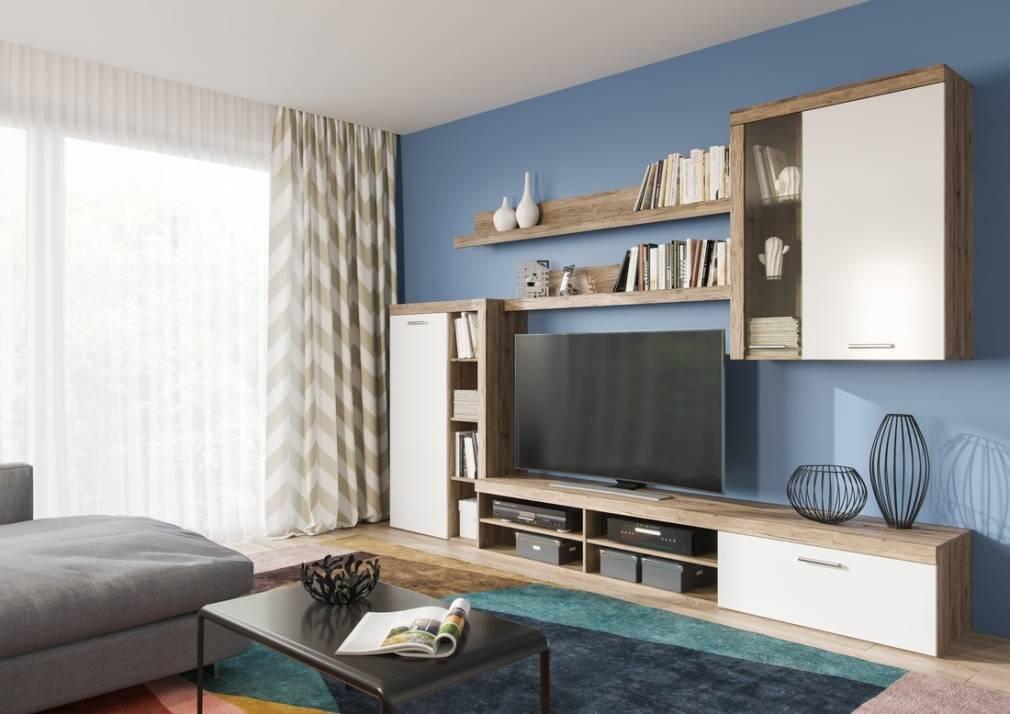 Отсутствие громоздких шкафов в наборе мебели отлично компенсируется невысоким стеллажом с открытыми и закрытыми  полками, большой ТВ-тумбой и навесным шкафчиком со стеклянной дверцей.