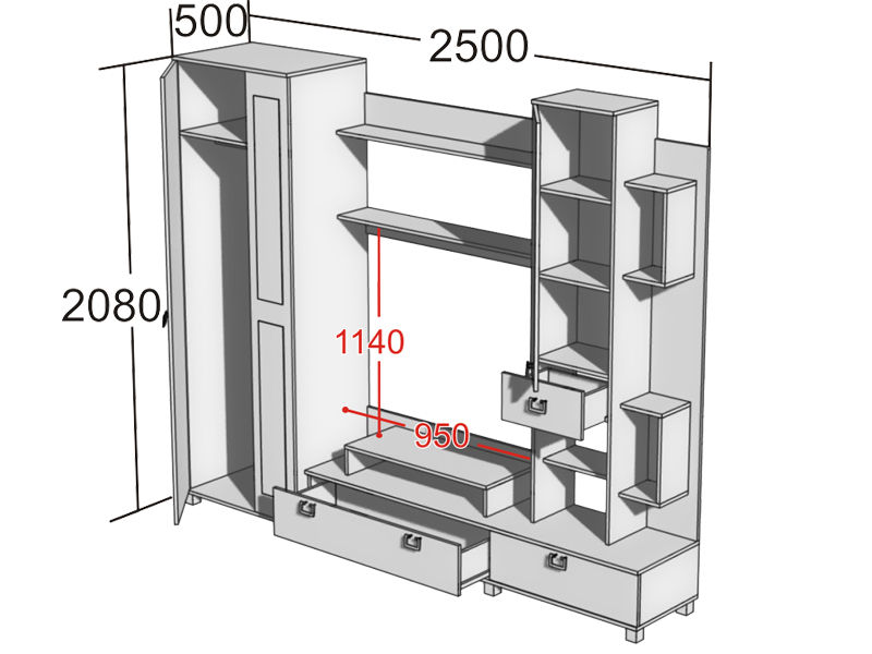 • Шкаф с двумя открытыми и тремя закрытыми полками, выдвижным ящиком, а также с двумя узкими декоративными нишами.
