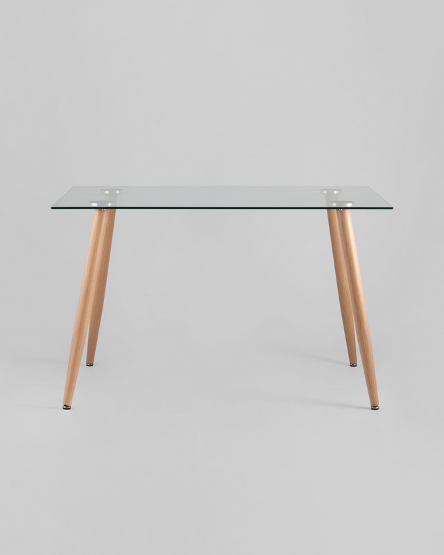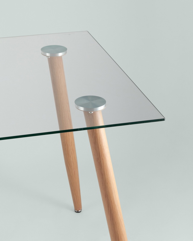 Обеденный стол со стеклянной столешницей. Закаленное стекло выдерживает большие нагрузки, обладает высокой термоустойчивостью и прочностью.