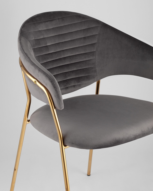 Стильный мягкий стул с подлокотниками и ножками золотого цвета.