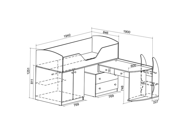 Состоит из: спального места, рабочего стола и шкафа и комода для одежды. Сборка универсальная.