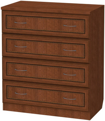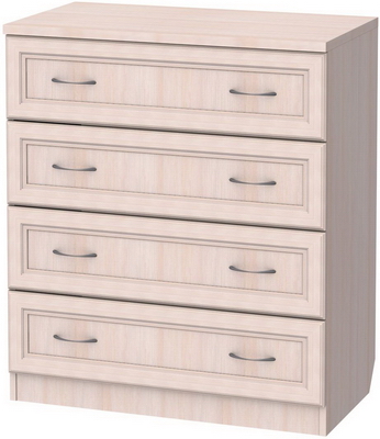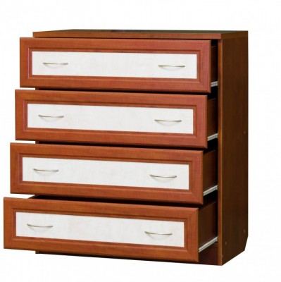Комод оборудован четырьмя ящичками, дополненными выдвижным механизмом, в которых можно хранить различные вещи. Механизм движения состоит из прочных металлических и пластмассовых элементов, которые способны выдержать не одну сотню закрываний и открываний. Довольно часто такие комоды устанавливают в детских комнатах, поскольку в них очень удобно хранить одежду для детей. Ящички оснащены металлическими ручками удобной формы и дополнительным декоративным украшением в форме правильного четырехугольника, которое подчеркивает строгую красоту и изысканность этого предмета мебели. Внутреннее пространство выдвижных ящичков довольно большое, что позволяет хранить даже постельные принадлежности, благодаря чему комоды нередко располагают в спальных комнатах.