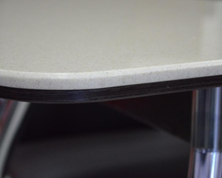 Раздвижной полуовальный стол "Турин мини" (пр-во Россия). Комбинированная столешница: ЛДСП 10 мм и искусственный камень 12 мм. Центральная вставка - "бабочка" шириной 32 см позволяет легко разложить стол до размеров 60х122 см. Искусственный камень естественных расцветок является ударопрочным и практичным материалом. Полированная поверхность камня обладает мягким блеском. Торец ЛДСП облицован ПВХ-кромкой.